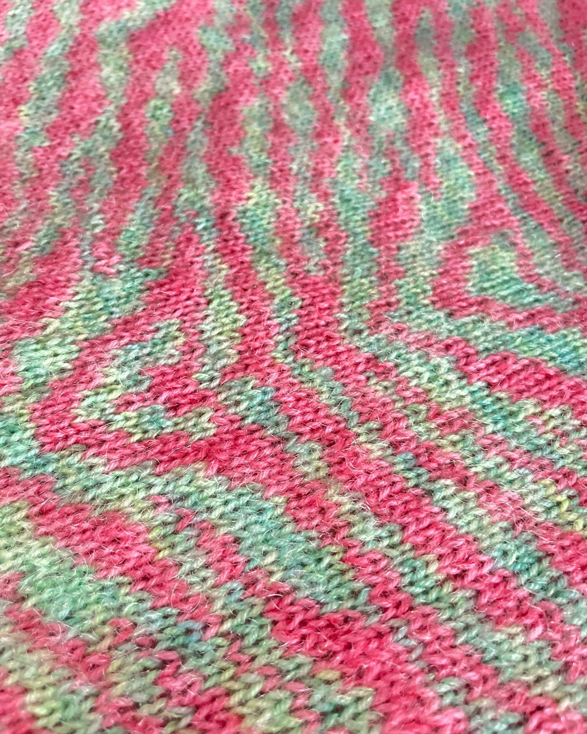 Zebra Skirt is a tight-fitting model in two-coloured double knitting. The skirt is worked in the round from the top down. It can be worked with a ribbing in two-coloured double knit rib or as a drawstring hem with an elastic band. The skirt is shaped to fit the curves of the body by de- and increasing. At the bottom the work is divided into front and back and worked individually back and forth creating a slit on each side. The slits and bottom are worked in a single-coloured double knit stitch and bound off using the Italian bind-off technique.