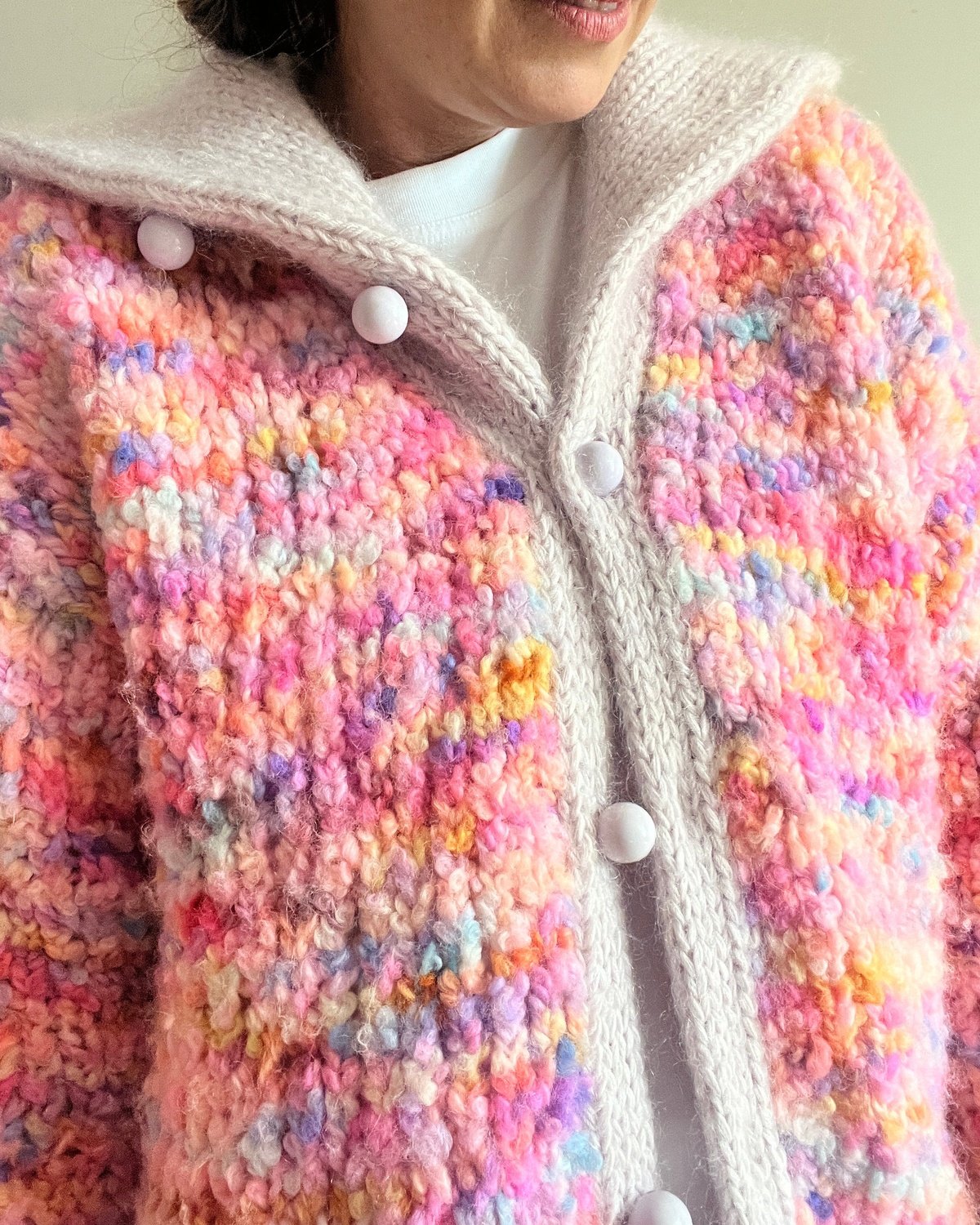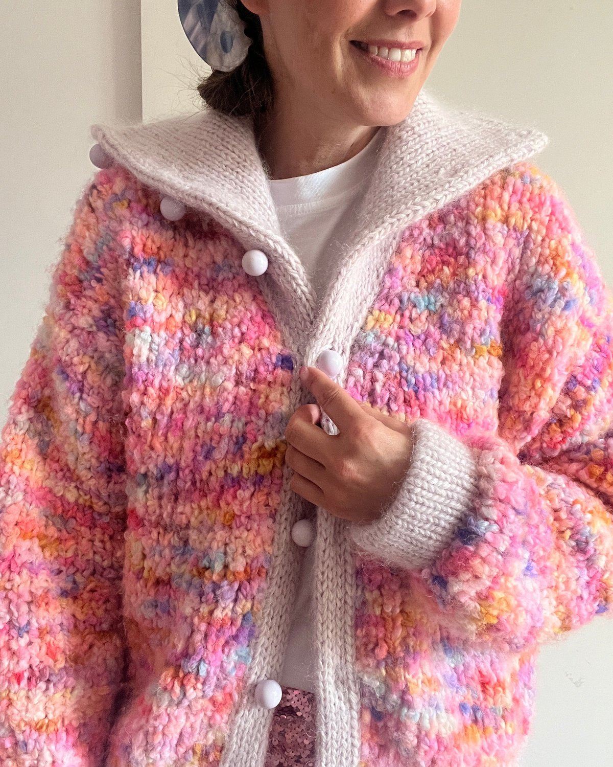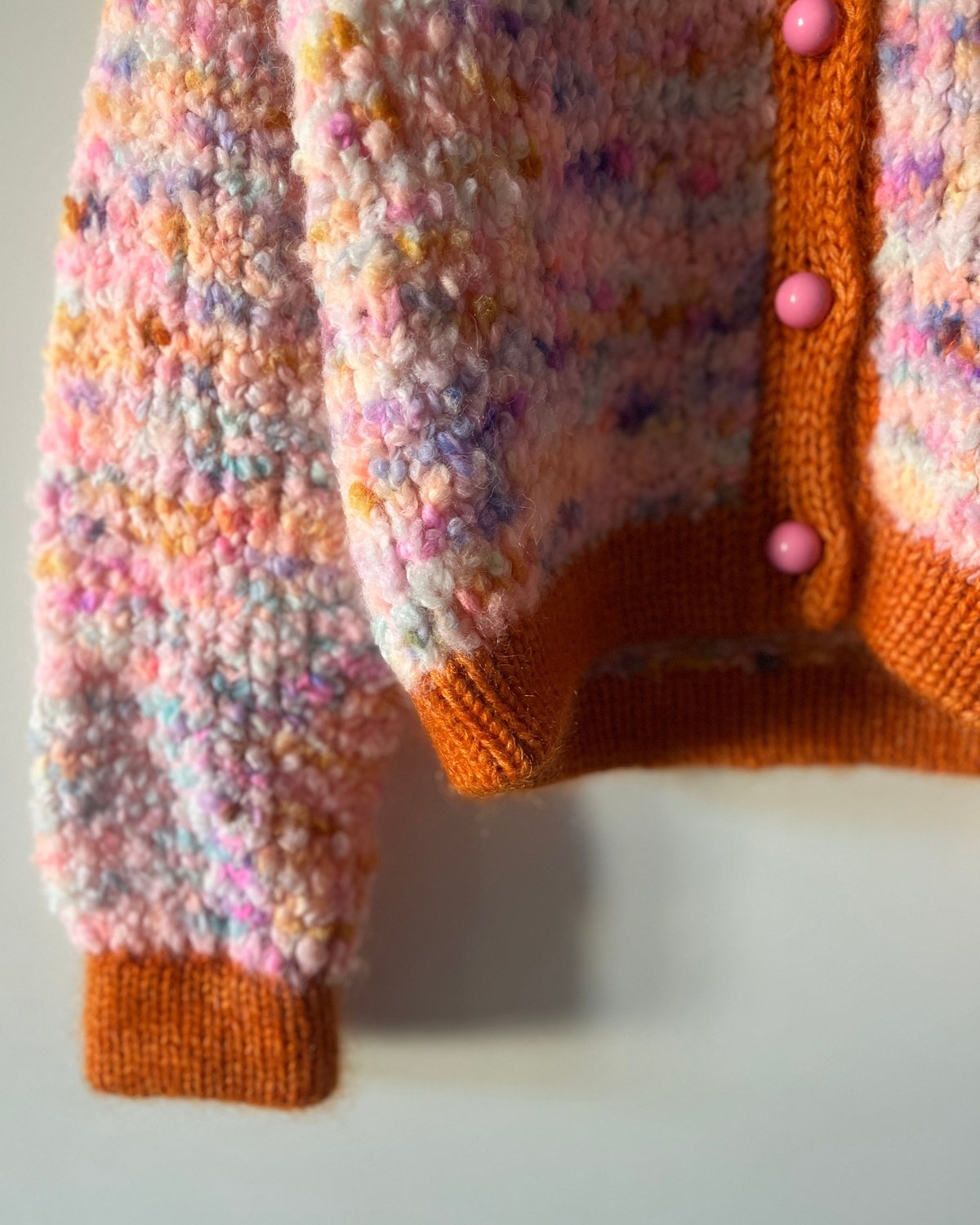 Juicy Jacket is an oversized model worked in boucle (yarn A) with trims in double knit stitch in 3 strands of merino held together with 3 strands of mohair (yarn B), which both gives a perfect contrast and a nice hold.