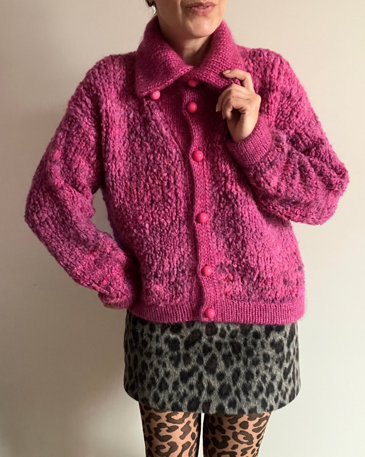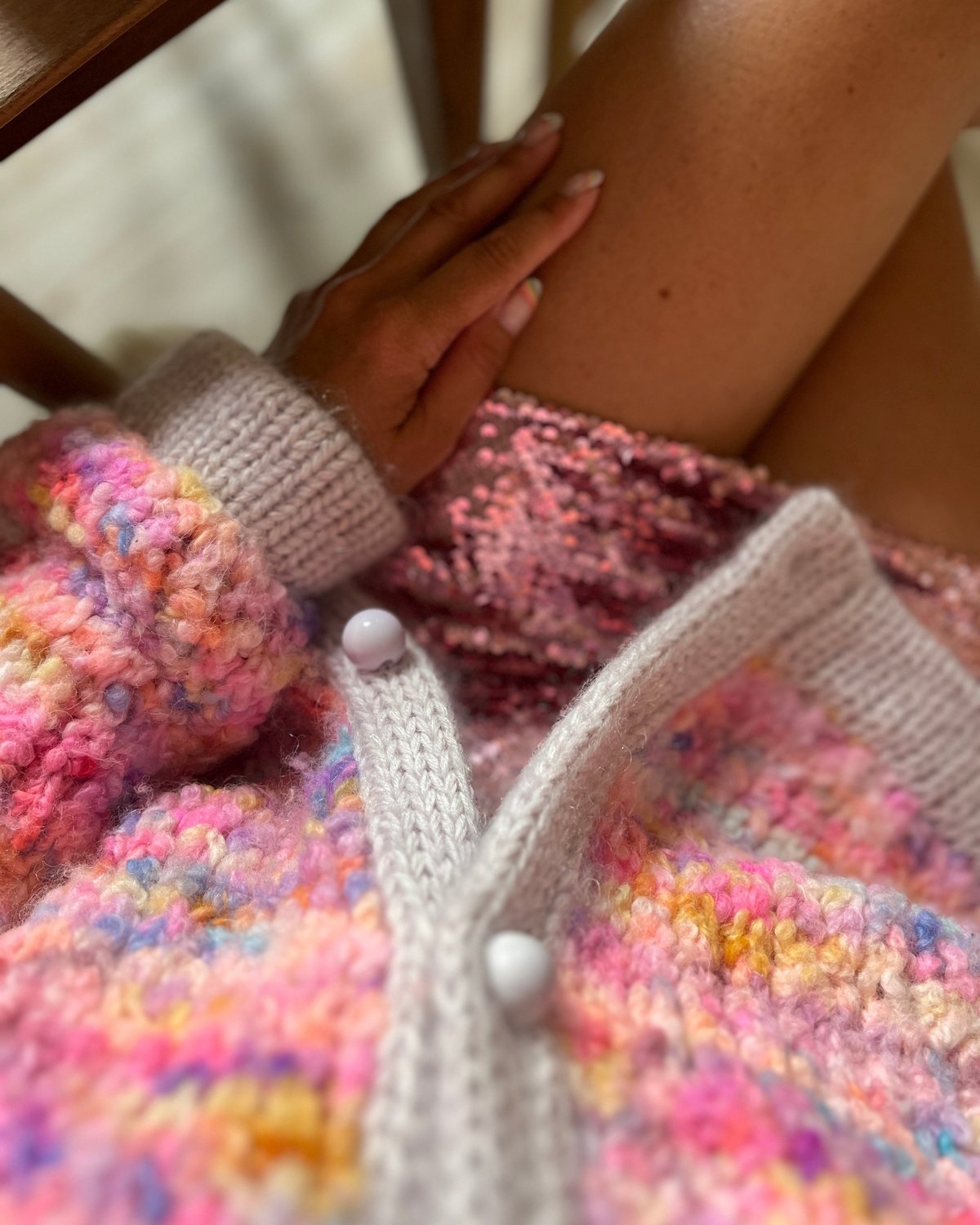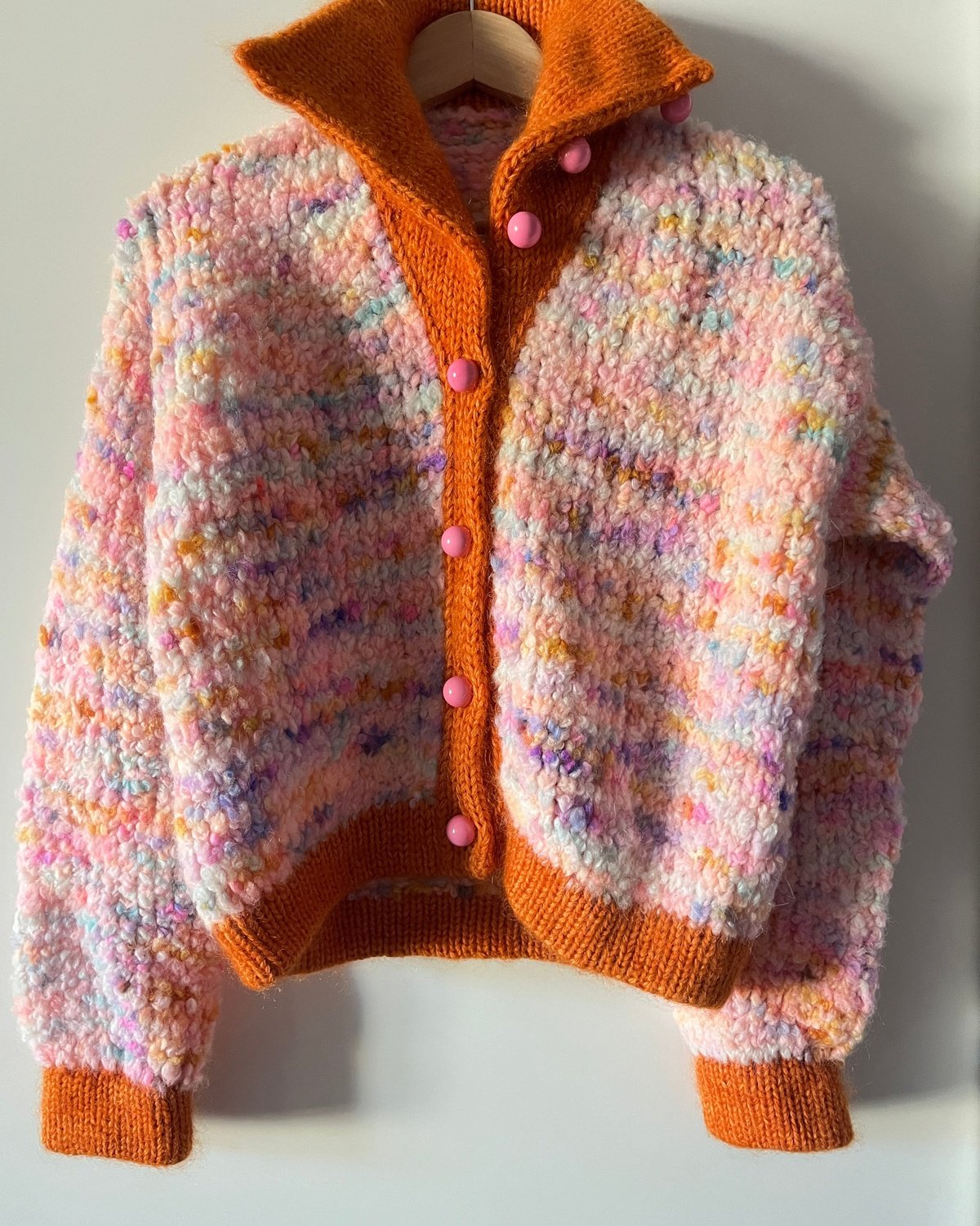 Juicy Jacket is an oversized model worked in boucle (yarn A) with trims in double knit stitch in 3 strands of merino held together with 3 strands of mohair (yarn B), which both gives a perfect contrast and a nice hold.