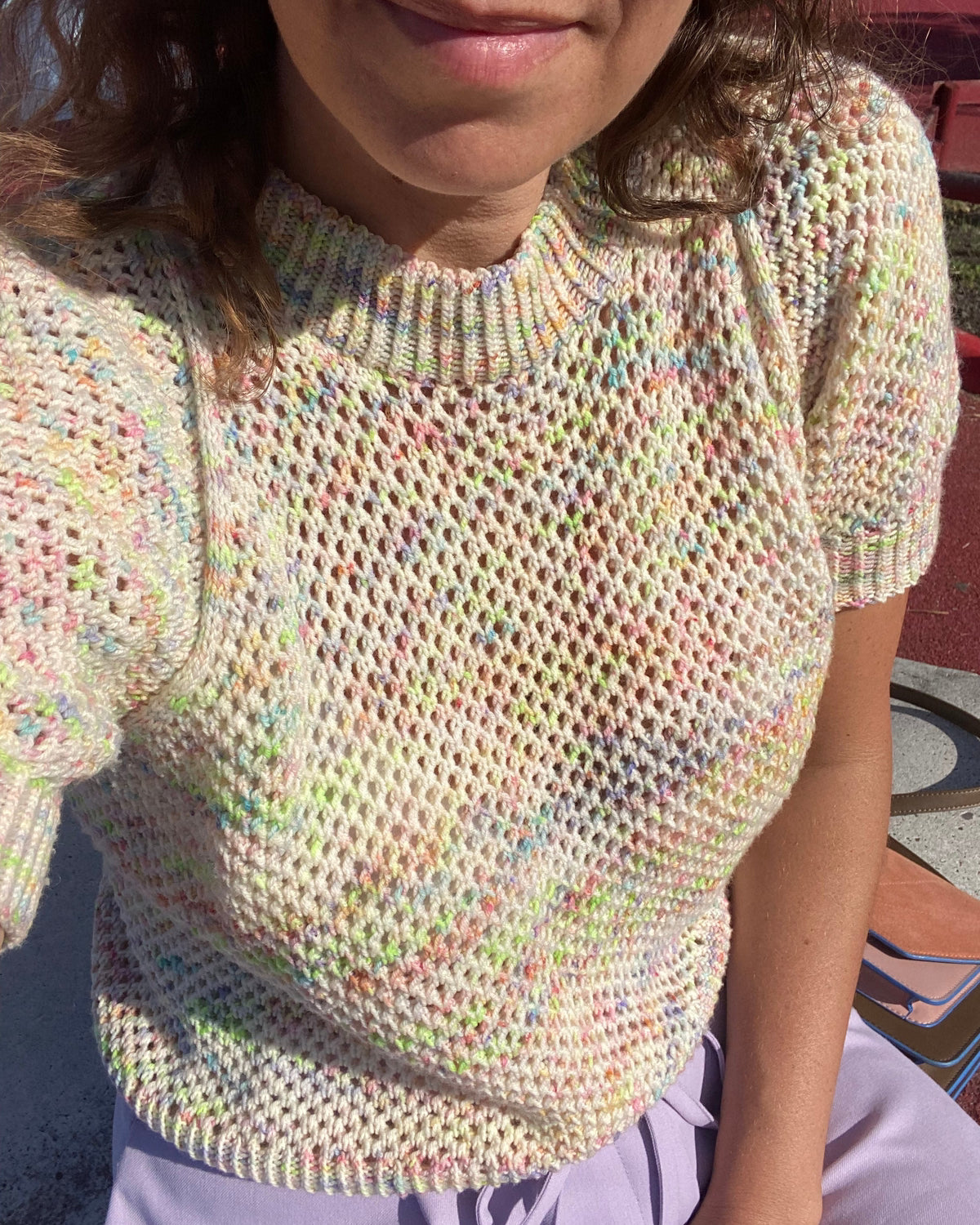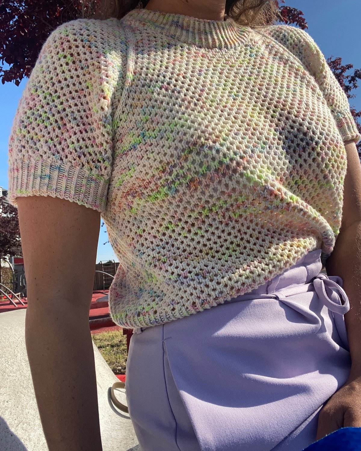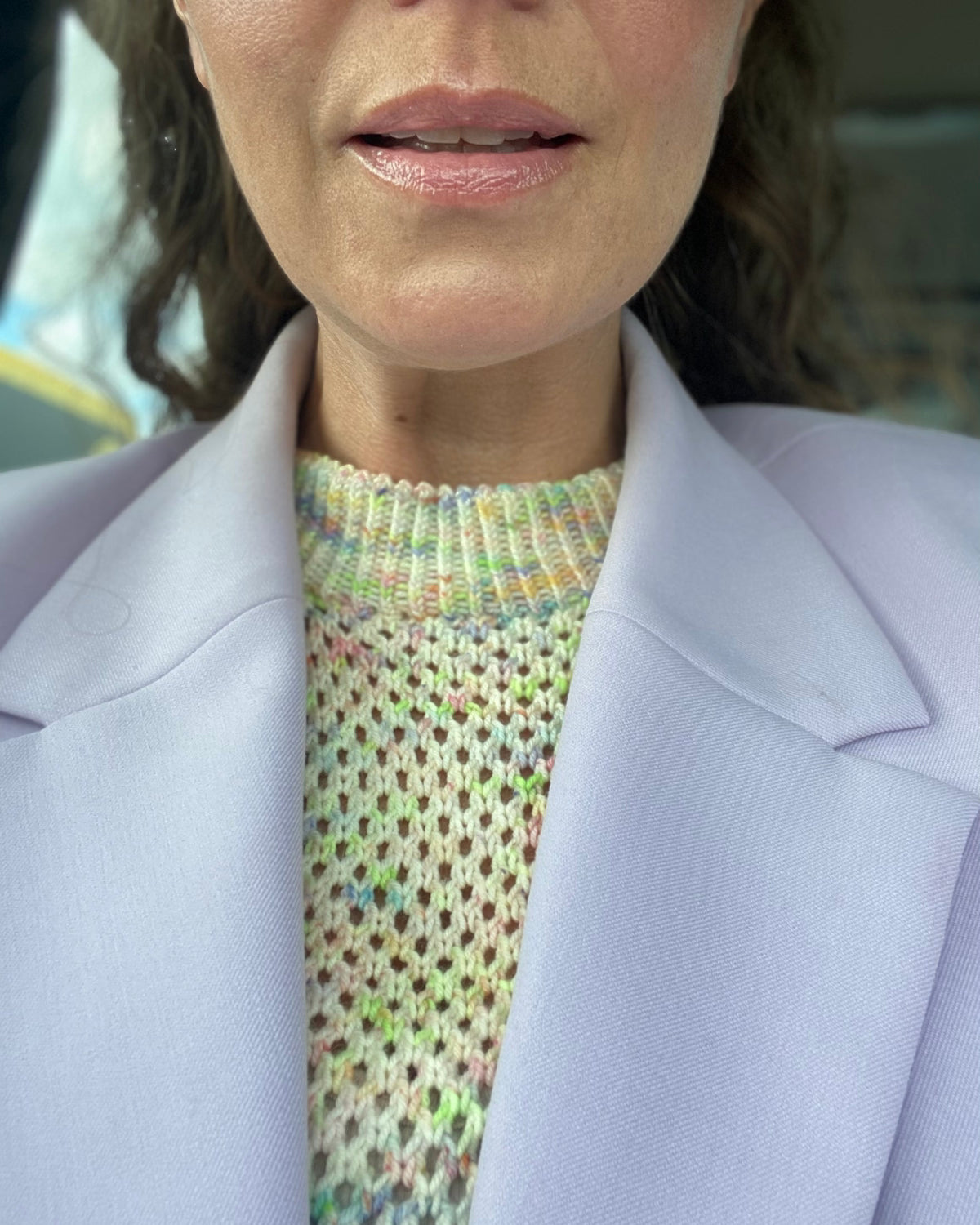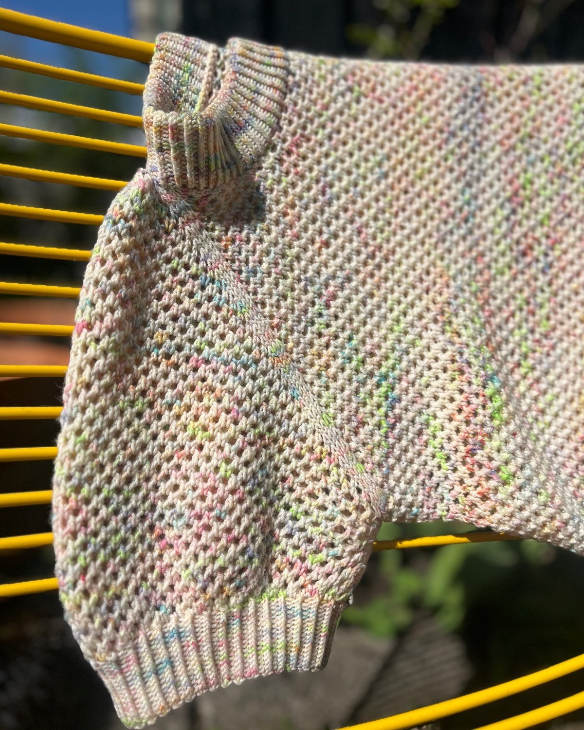 Die Arbeit wird von oben nach unten gestrickt mit Wendereihen am Hals um den Ausschnitt vorne etwas niedriger zu gestalten, um eine schöne Passform zu erreichen. Es werden, an der Brustpartie, Zunahmen gemacht um drei Glattrechts gestrickte Maschen, bevor in Ärmel und Körper aufgeteilt wird. Auf diese Weise können die Maße auch leicht,  in der Länge, angepasste werden. Am oberen Teil der Ärmel wird eine Wiener Falte gemacht, bevor die Halskante gestrickt wird, dadurch entsteht ein kleiner Puff.