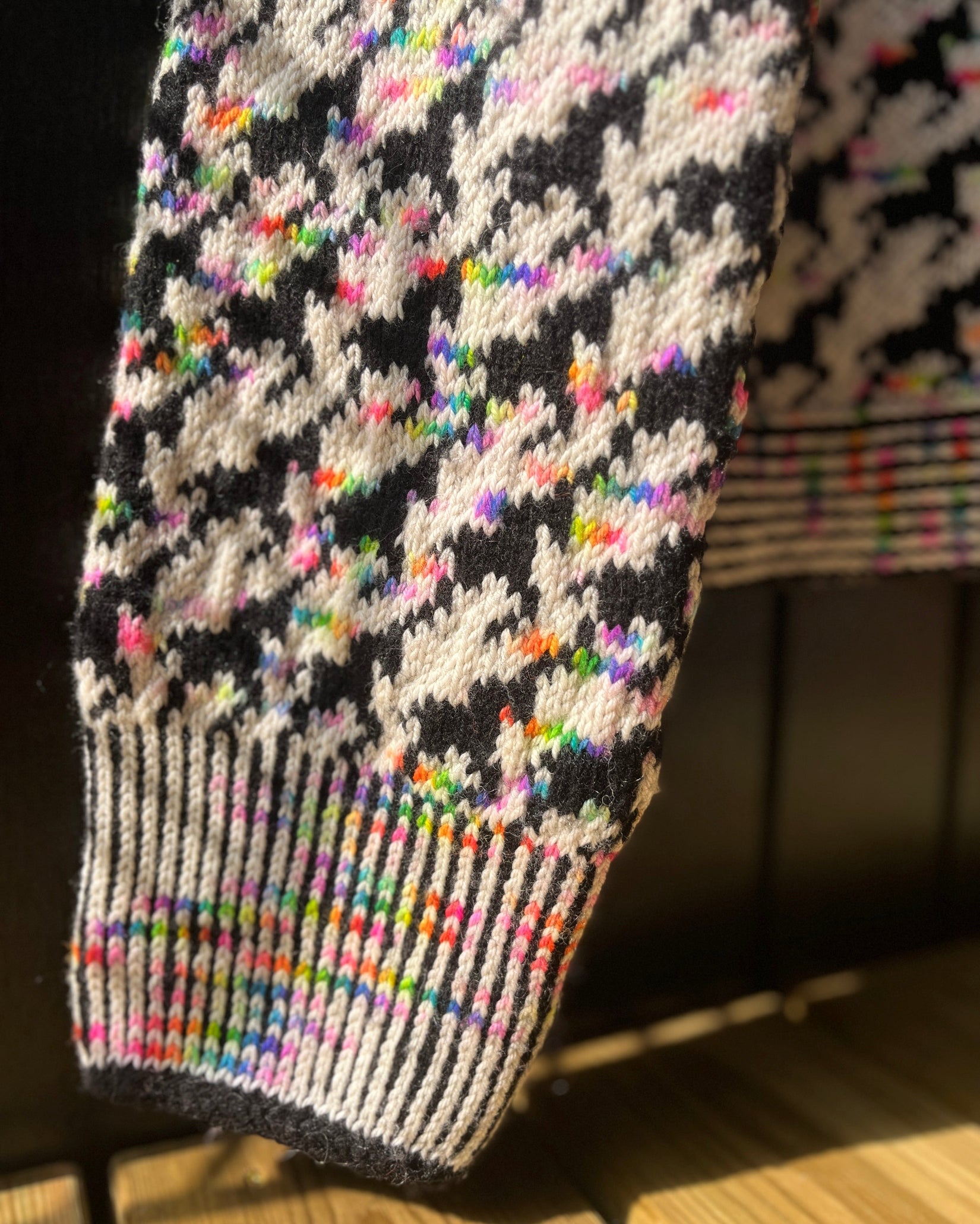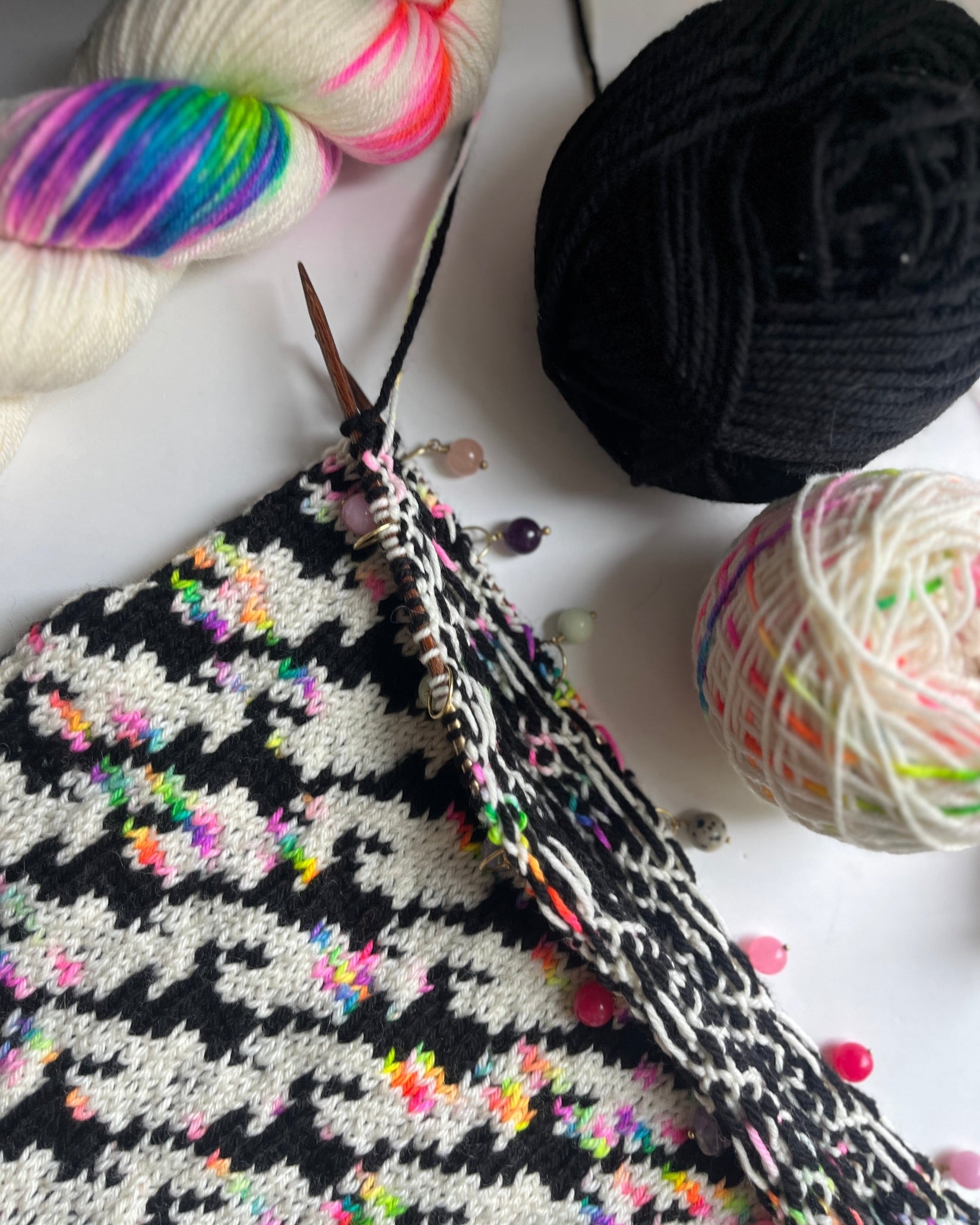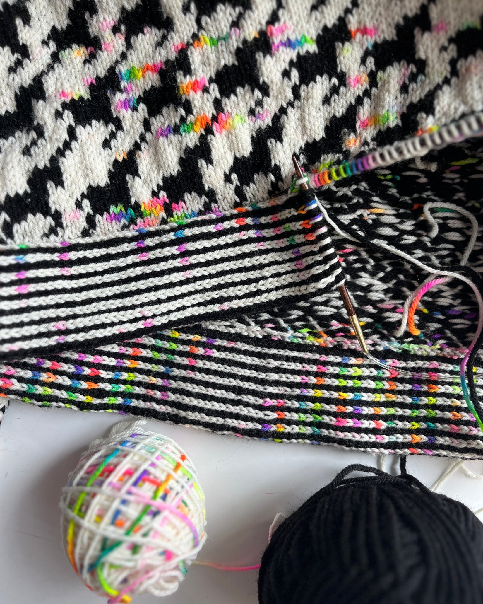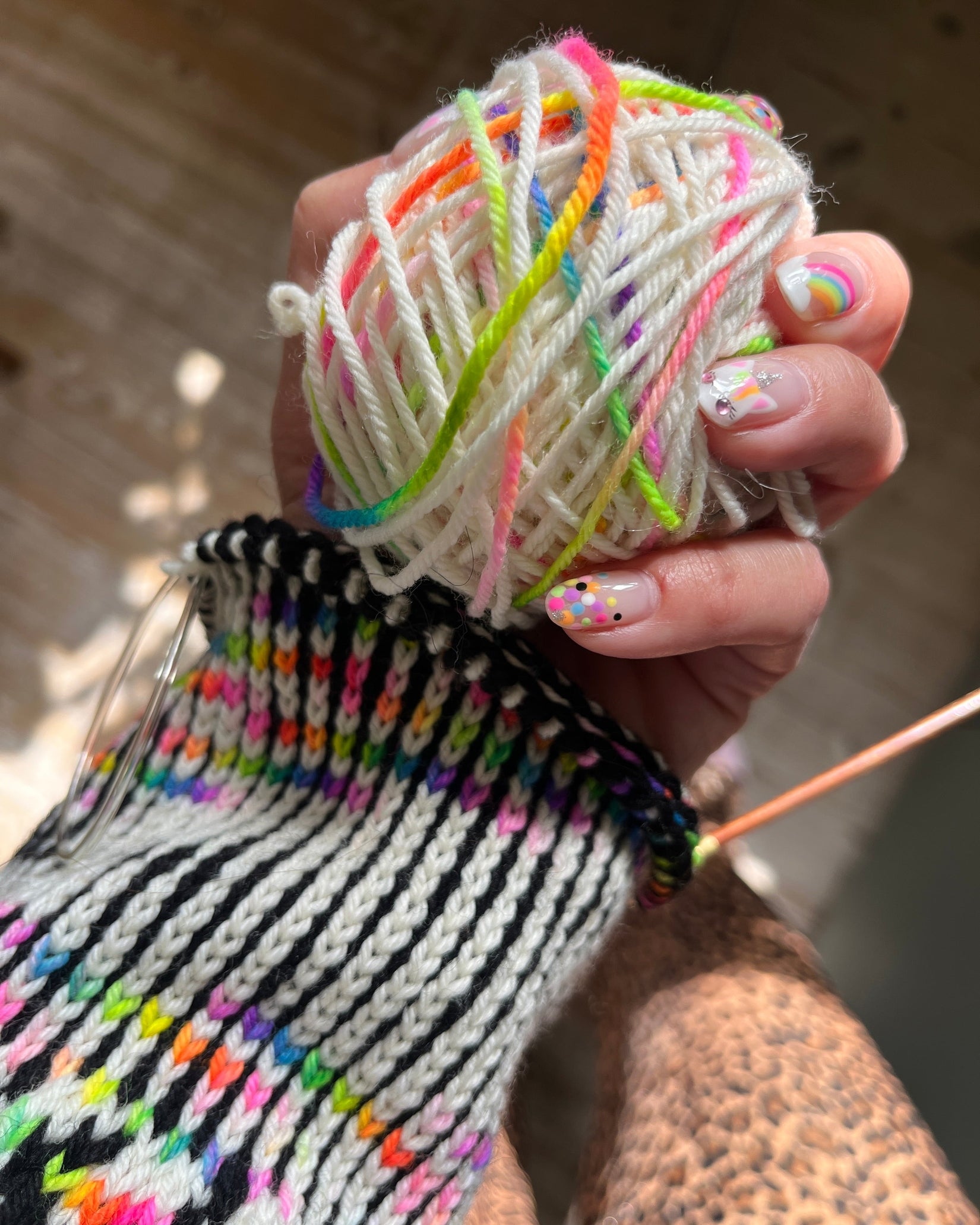 24 masker • 22 pinde i tofarvet dobbeltstrik på pind 4 = 10 • 10 cm